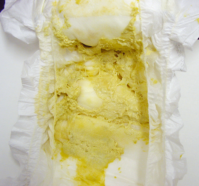 Die Abbildung zeigt den Blick in die Windel des Kindes. Die Entfärbung des Stuhls ist Folge fehlender enteraler Galleausscheidung. Die gelbliche Farbe in der Windel kommt durch den für einen Säugling verhältnismäßig dunklen Urin zustande, der durch die vermehrte renale Bilirubinausscheidung dunkler gefärbt ist. Verlauf und klinischer Befund des Ikterus prolongatus mit eindeutig acho­lischem Stuhl sprechen für eine neonatale Cholestase; somit muss zeitnah weiterführende Diagnostik eingeleitet und insbesondere die Frage geklärt werden, ob eine Gallengang­atresie vorliegt.