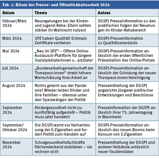 Die Anzahl der Pressemitteilungen war 2023 und 2024 deutlich höher als in den Jahren zuvor. Im Folgenden ein kurzer und kompakter Überblick über die Presseveröffentlichungen der DGSPJ explizit im vergangenen Jahr (Tab. 1):