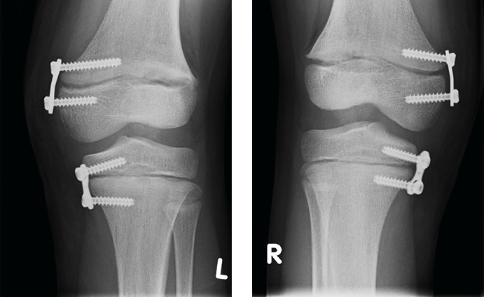 Nach Diagnose erfolgte eine den Leitlinien entsprechende Therapie. Die nächste kinderorthopädische Konsultation erfolgte ein Jahr nach Diagnosestellung. Trotz konsequenter Substitutionstherapie hatten sich die Genua valga nicht zurückgebildet, sondern noch verstärkt. Der Familie wurde eine wachstumslenkende Operation im Sinne einer medialen temporären Epiphyseodese mittels 8-Plates empfohlen, welche dann auch durchgeführt wurde (Abb. 2).