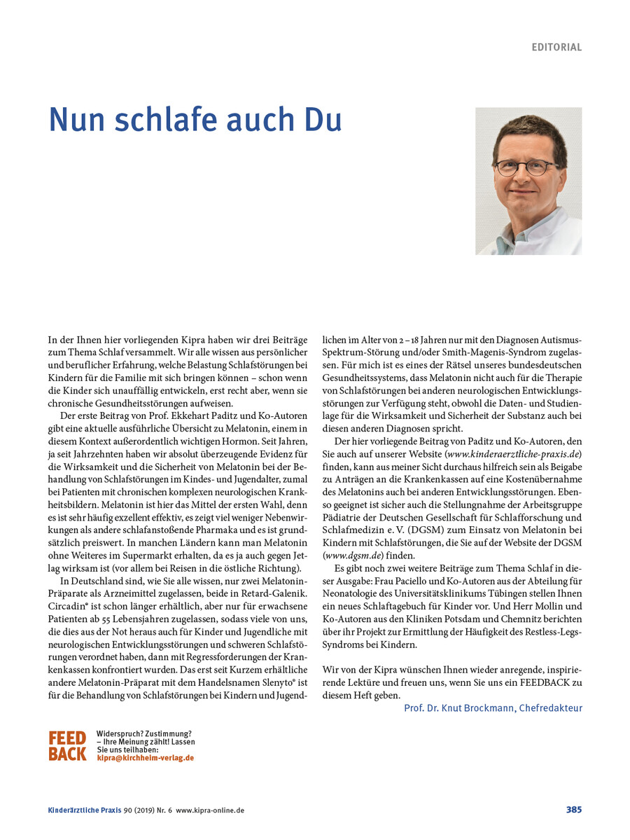 Im Editorial "Nun schlafe auch Du", Kinderärztliche Praxis 6/2019, hat Chefredakteur Prof. Brockmann eine Lanze für die Melatonin-Behandlung von Kindern mit Einschlafstörungen gebrochen. Hier ein Leserbrief mit Tipp dazu.