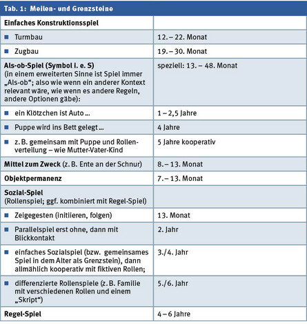 Die kindliche Entwicklung kann gut anhand des Spielverhaltens eingeschätzt werden. Die entsprechenden Meilen- und Grenzsteine sind in der Tabelle 1 dargestellt.