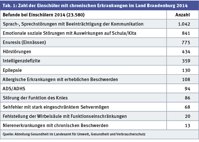 Zu den chronischen Erkrankungen (12,8 % aller Einschüler) zählen sowohl erhebliche Entwicklungsdefizite wie Sprachstörungen, die die Kommunikation des Kindes beeinträchtigten, als auch psychische Störungen (ADS/ADHS, emotionale und soziale Störungen, Enuresis) sowie neurologische und andere somatische Erkrankungen (Tab. 1).