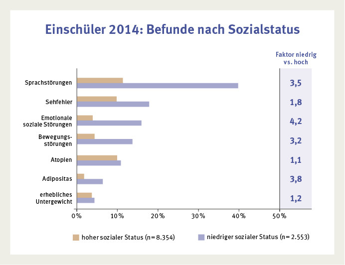 Der Morbiditätswandel im Kindesalter bringt zusätzliche Herausforderungen für die Schule mit sich. Die Infektionserkrankungen sind durch psychische Störungen, Entwicklungsdefizite und chronische Erkrankungen abgelöst worden. Die Brandenburger Analysen zur Gesundheit der Einschulungskinder [8] zeigen für das Jahr 2014 folgende schulrelevante gesundheitliche Einschränkungen: Bei 30 % der Kinder wurden schulrelevante Entwicklungsdefizite festgestellt (darunter 20 % Sprach- und Sprechstörungen bzw. 7 % Bewegungsstörungen), 12,8 % der Kinder zeigten eine chronische Erkrankung, 13 % psychische Störungen und bei 3 % der Kinder lag ein starkes Übergewicht bzw. bei 4 % ein erhebliches Untergewicht vor. Die soziale Lage beeinflusst erheblich den Schulstart. Kinder aus Familien mit niedrigem Sozialstatus zeigen häufiger Gesundheitsstörungen als Kinder aus Familien mit hohem Sozialstatus (Abb. 1).