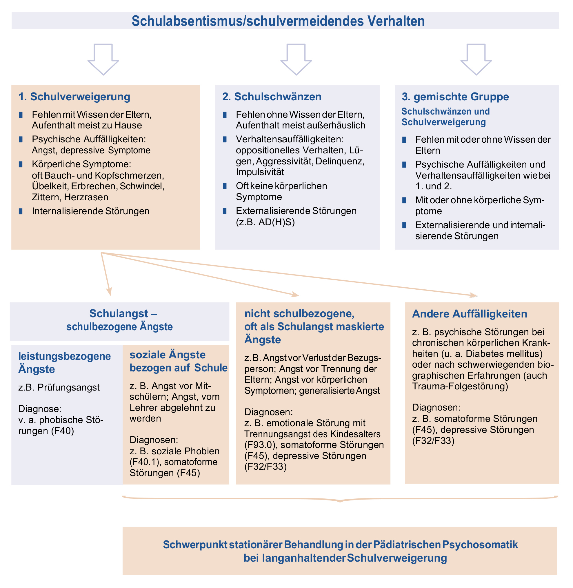 Bei schulvermeidendem Verhalten werden Kinder und Jugendliche häufig einer Vielzahl von somatischen Untersuchungen, einschließlich invasiver Maßnahmen, unterzogen, ohne dass psychosoziale Faktoren ausreichend berücksichtigt werden. Besteht die Symptomatik über mehrere Monate fort und scheitert eine Rückführung in die Schule, stellt dies die Behandelnden vor eine besondere diagnostische und therapeutische Herausforderung.
