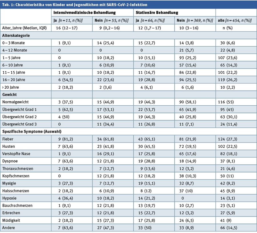 Die Höhe der C-reaktiven-Protein-Konzentration im Blut war assoziiert mit einer Intensivbehandlung. Die Autoren schließen aus ihren Untersuchungen, dass es ein altersabhängiges Risiko für schwerwiegende COVID-19-Verläufe gibt, insbesondere bei jungen Säuglingen oder älteren Erwachsenen. Die Tabelle fasst altersabhängig Charakteristika von SARS-CoV-2-Infektionen zusammen.