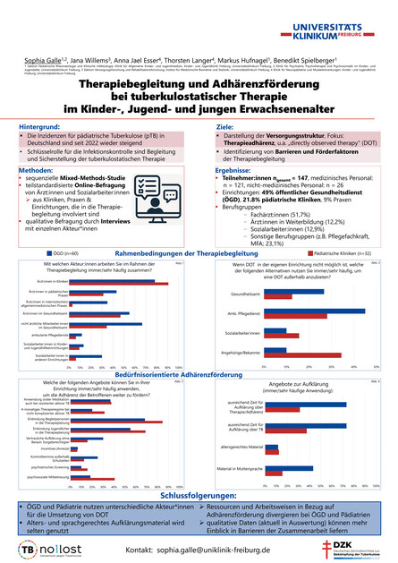 Sophia Galle führt das Projekt unter Leitung von Dr. Benedikt Spielberger als Promotionsprojekt bei Prof. Markus Hufnagel (Pädiatrische Infektiologie) und Prof. Thorsten Langer (AG Versorgungsforschung) an der Unikinderklinik Freiburg durch und arbeitet als Weiterbildungsassistentin in der Kinder- und Jugendpsychiatrie der Uniklinik Freiburg. Neben der Kinder- und Jugendklinik Freiburg sind die Sektion Versorgungsforschung und Rehabilitationsforschung (SEVERA) der Uniklinik Freiburg (Jana Willems) und das Deutsche Zentralkomitee zur Bekämpfung der Tuberkulose (DZK) an der Studiendurchführung und -rekrutierung beteiligt.